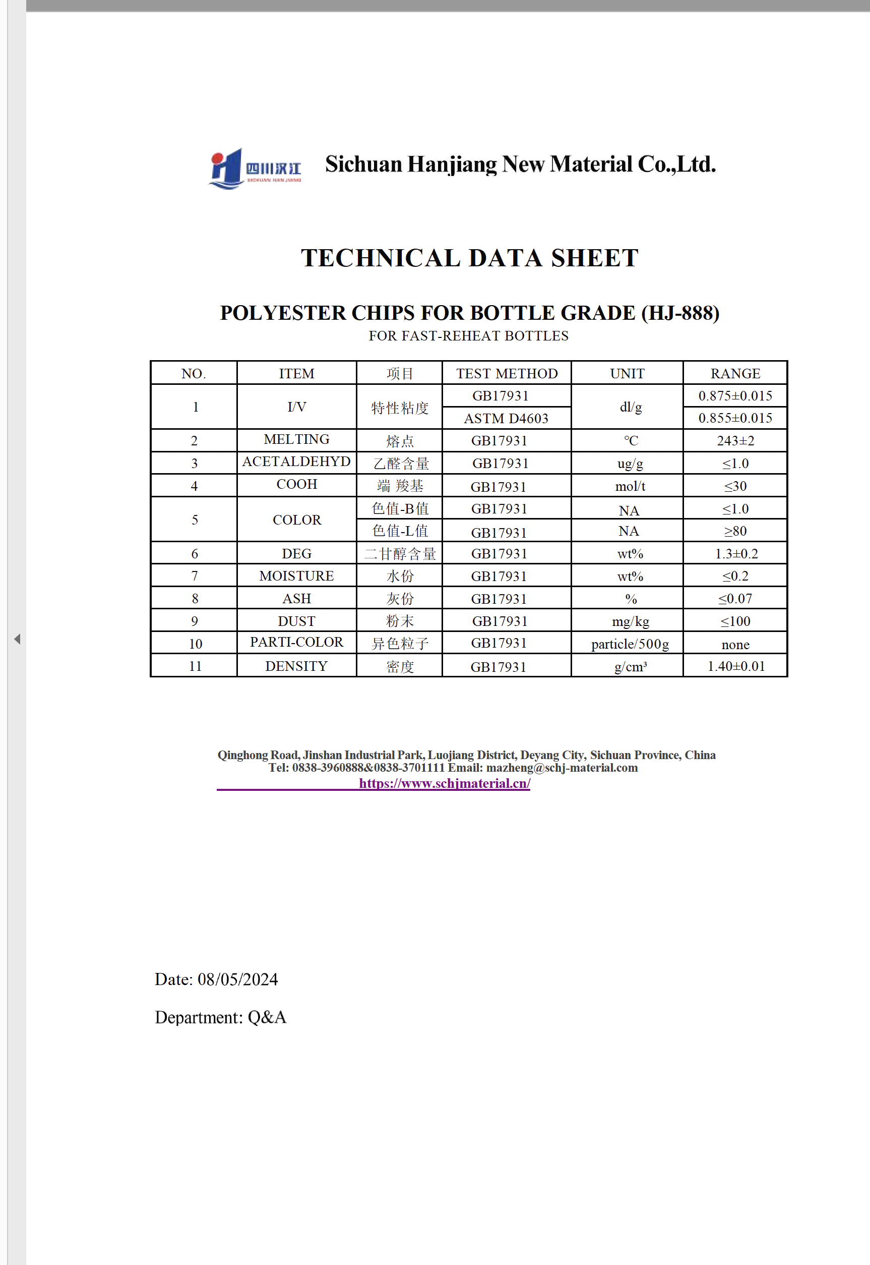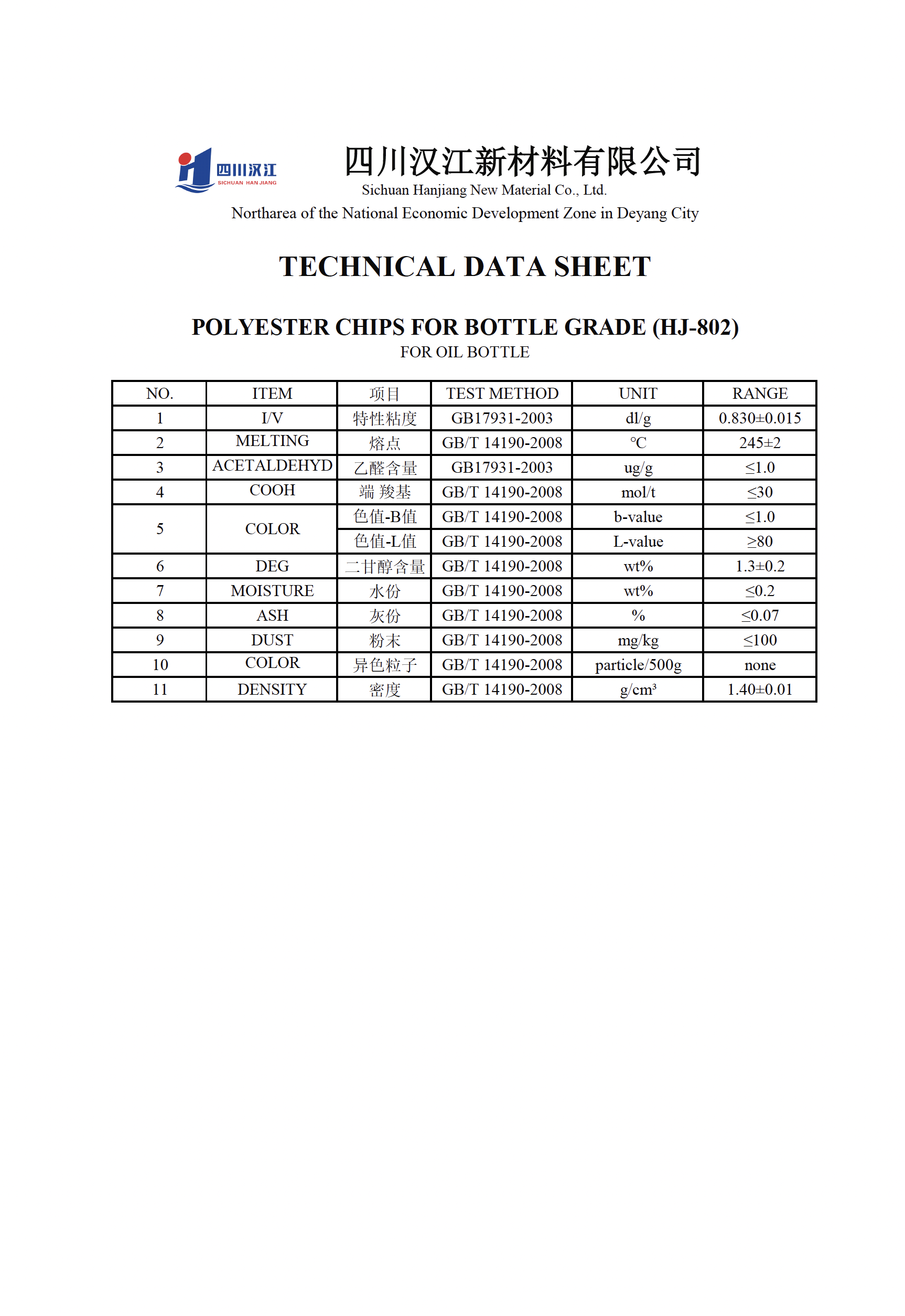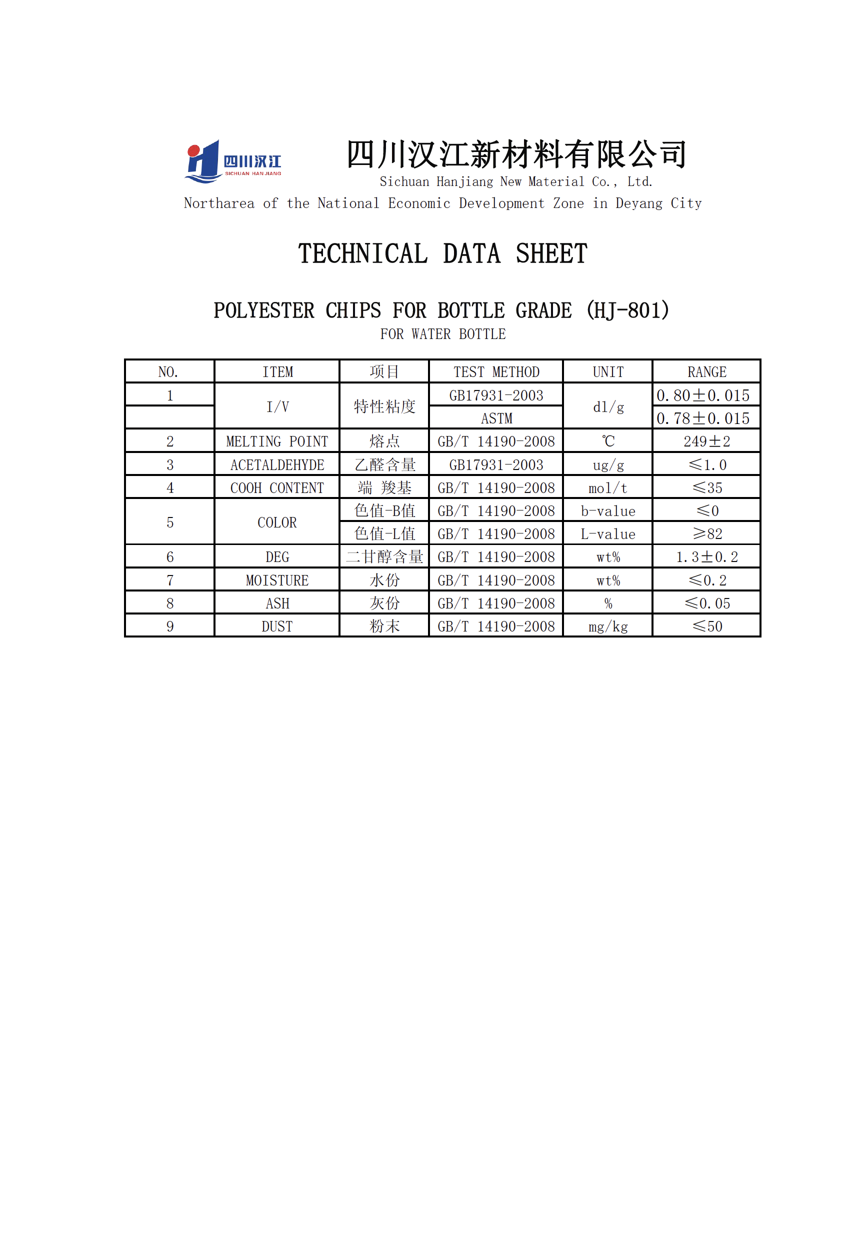 - Raw materials: PTA, MEG, IPA; compliant with GB/T17931-2018 standard