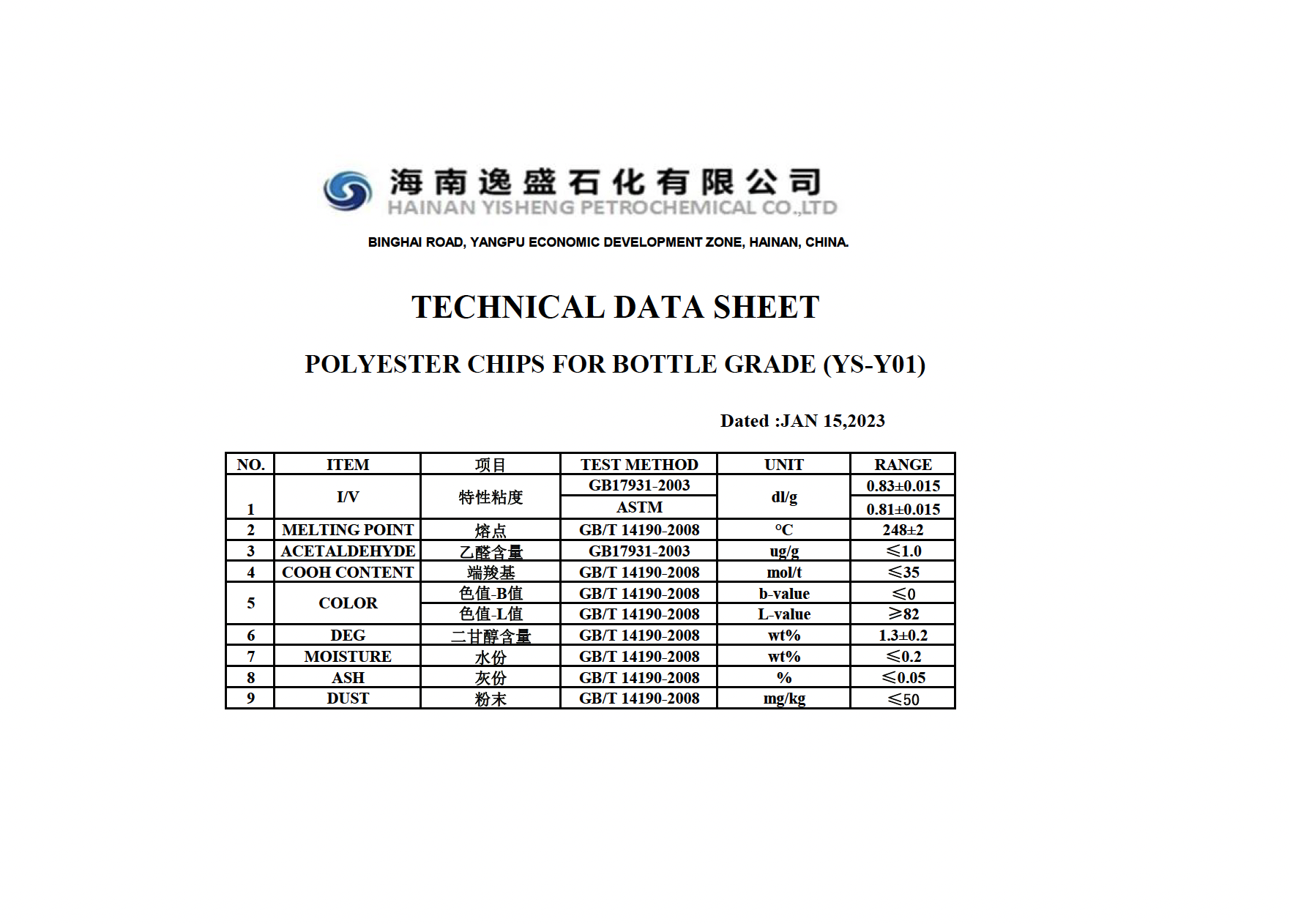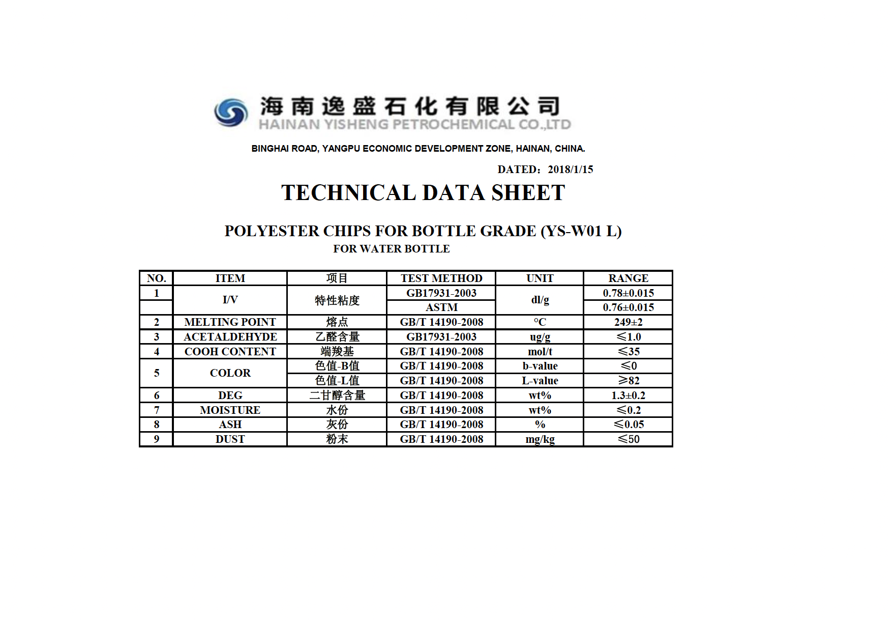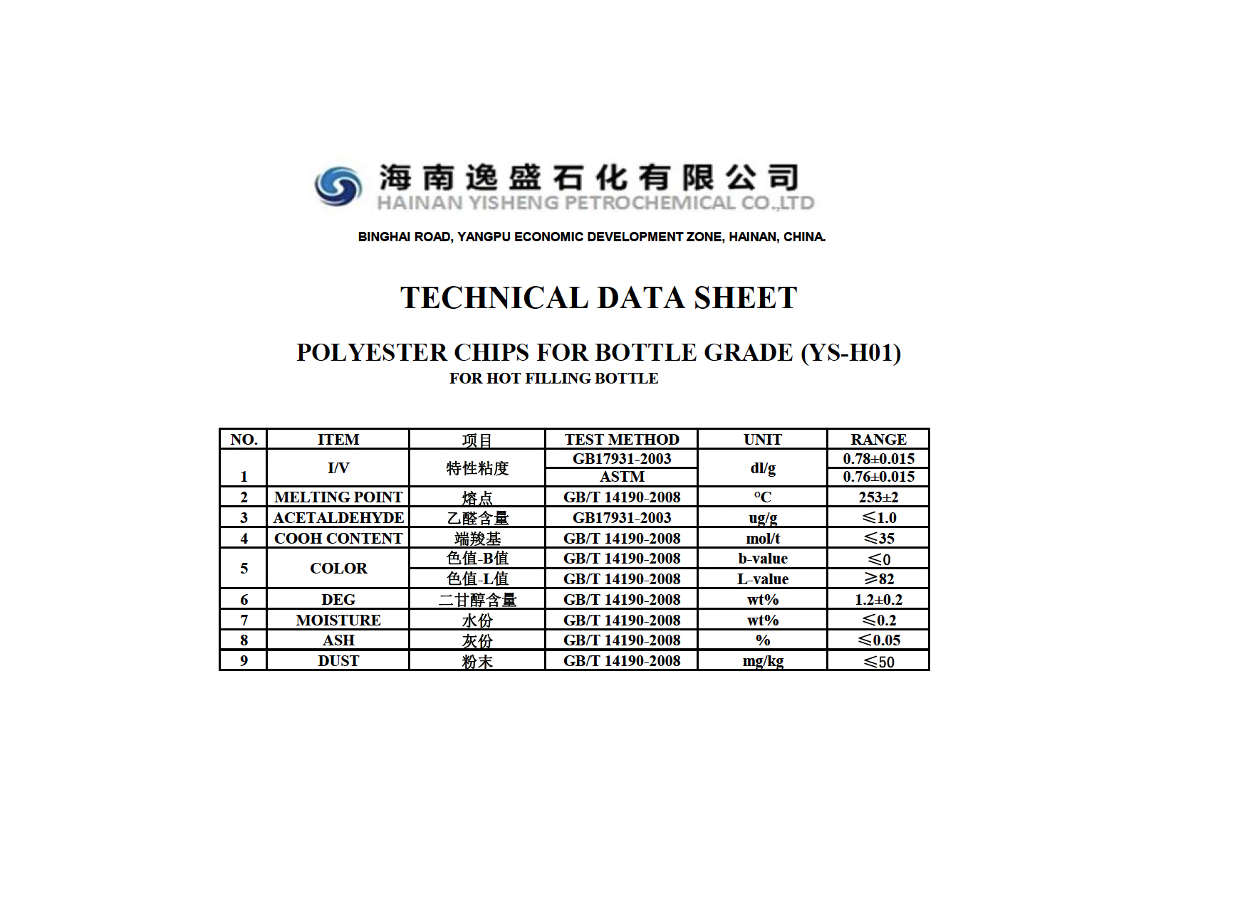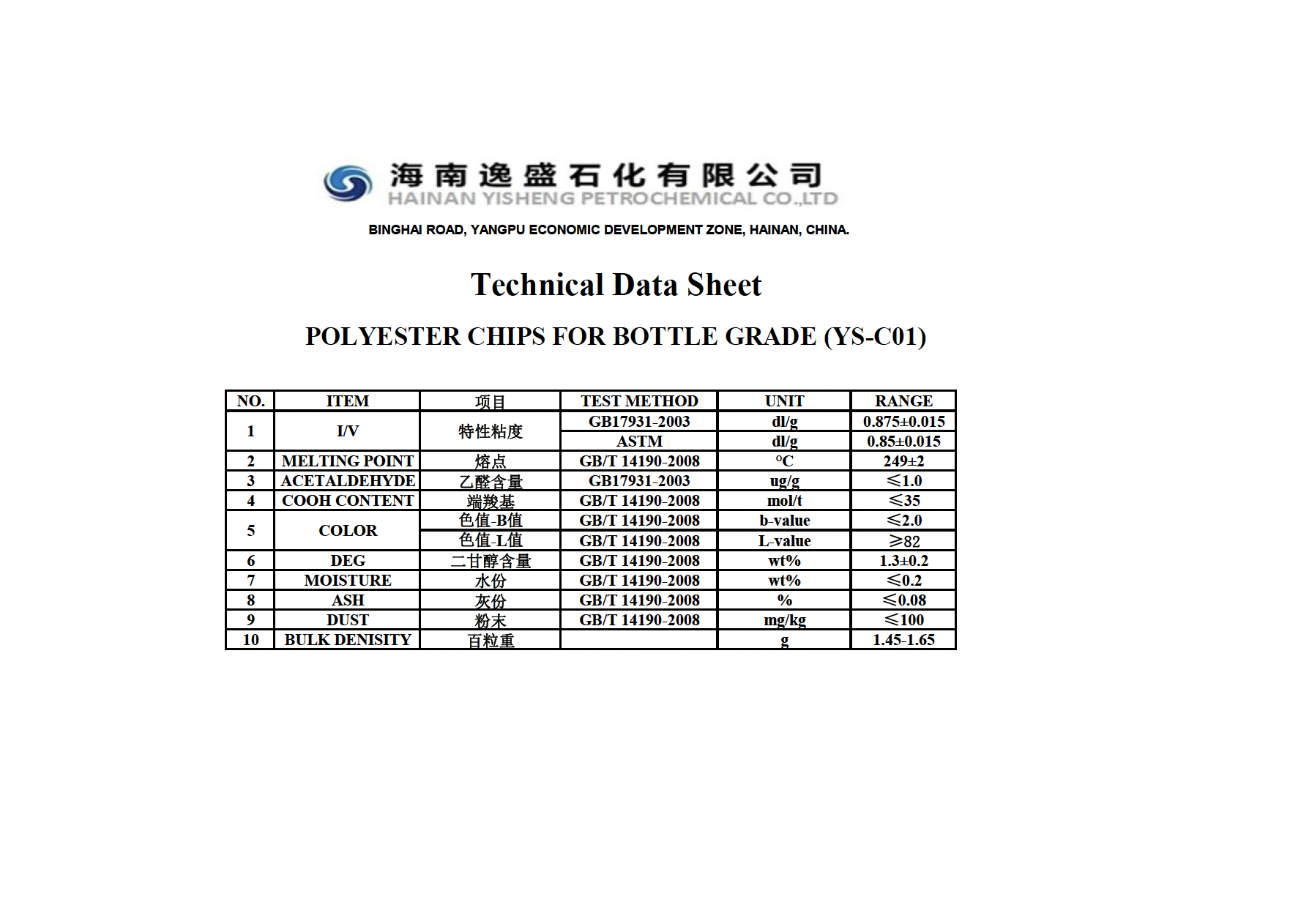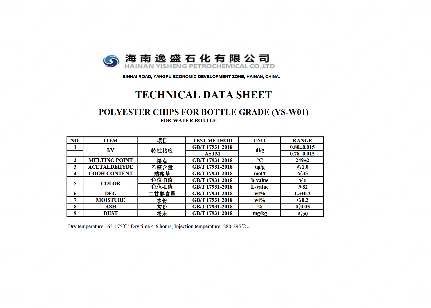 Yisheng’s bottle-grade polyester chips (PET) are food-grade polymer materials compliant with Chinese GB/T 17931-2018 and international FDA and EU food safety standards. They feature high transparency, low acetaldehyde, chemical resistance, and recyclability, and are widely used in various food and beverage packaging applications.