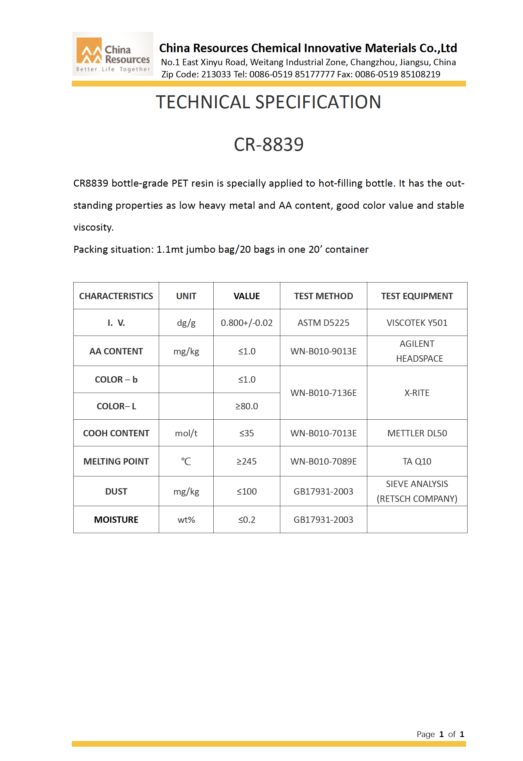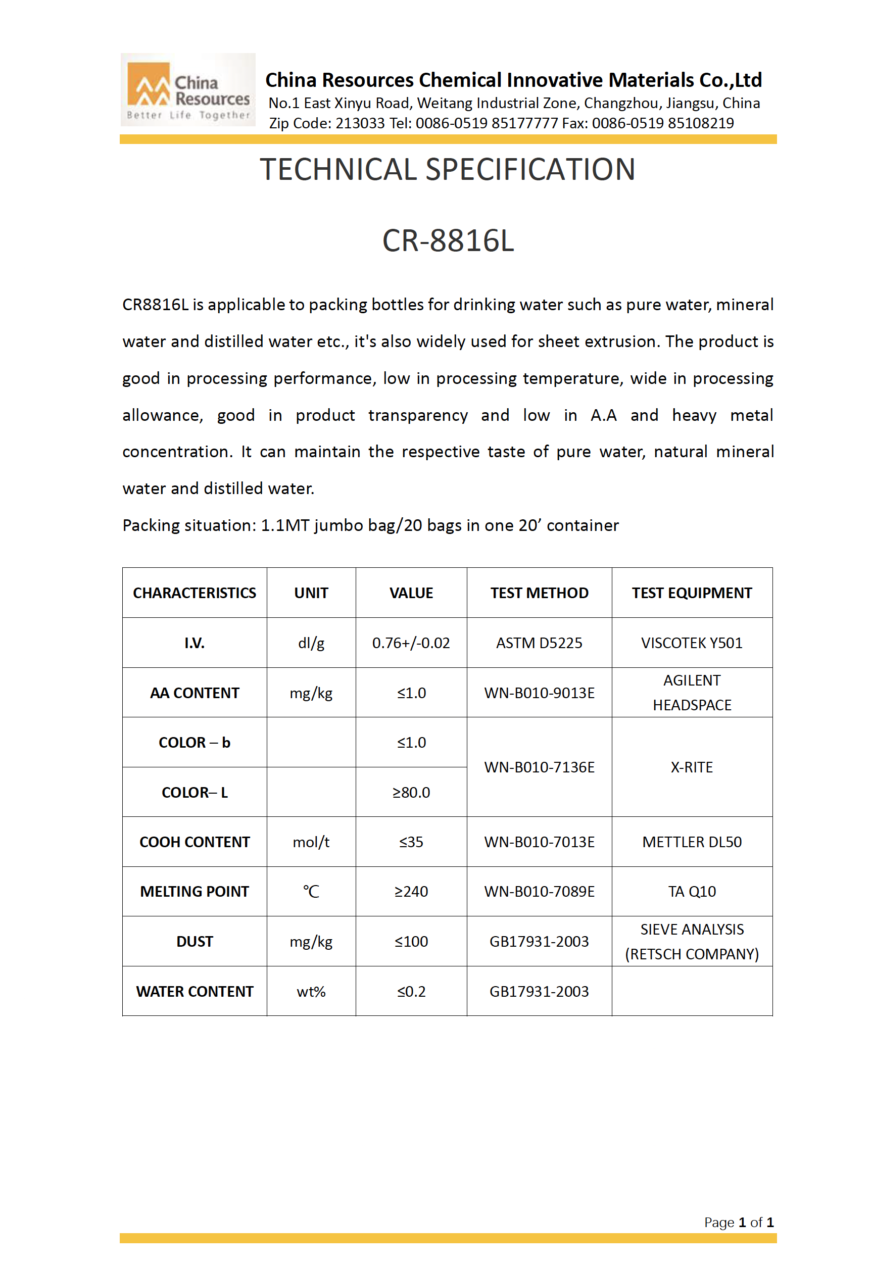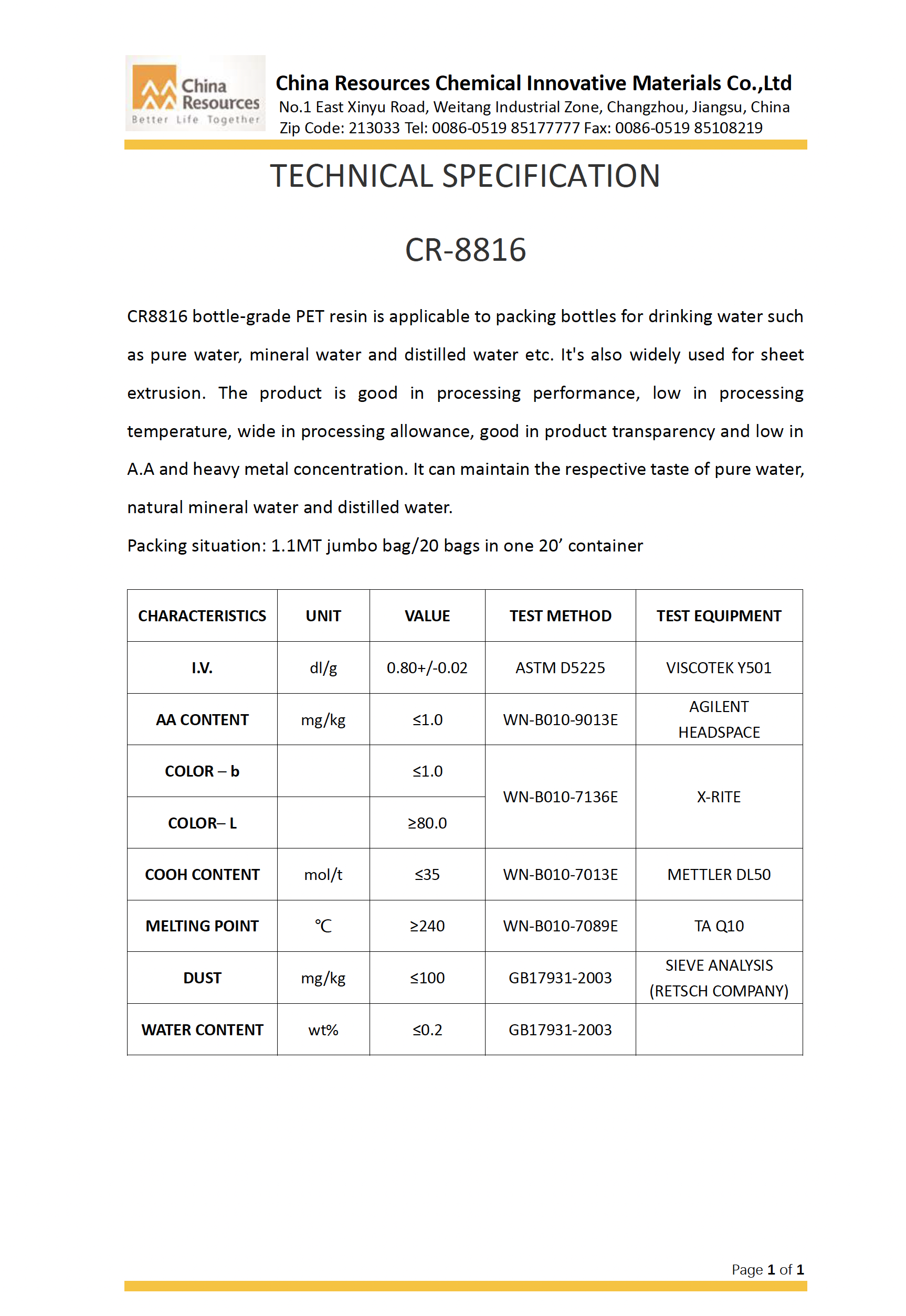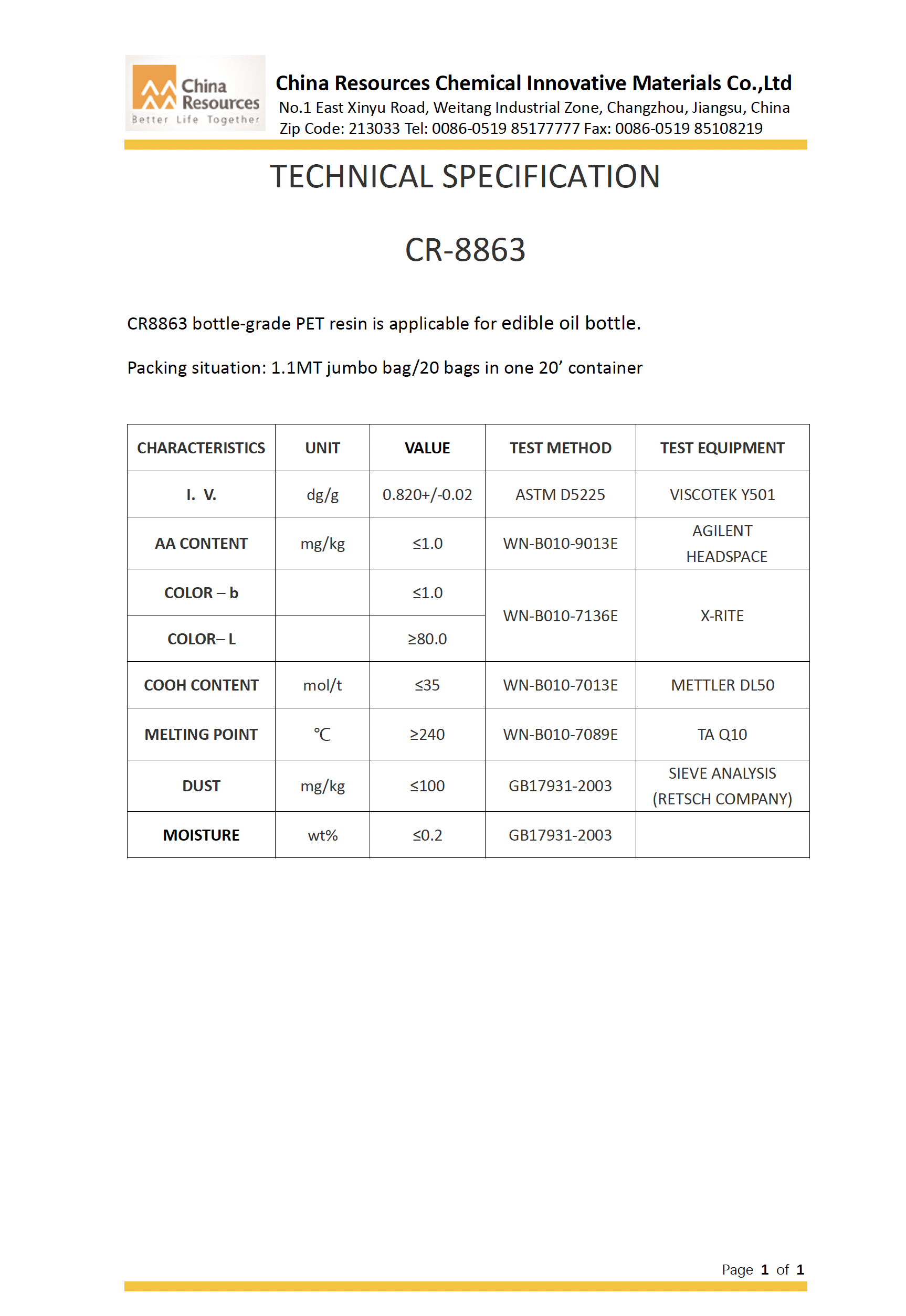 1. CR-8863 Oil Bottle Grade PET
