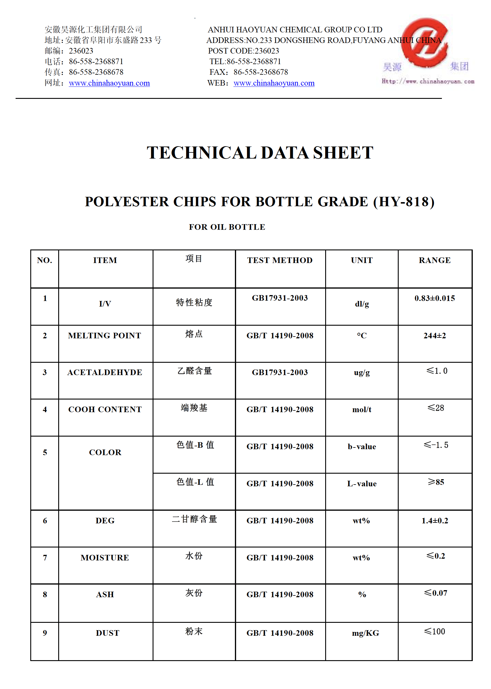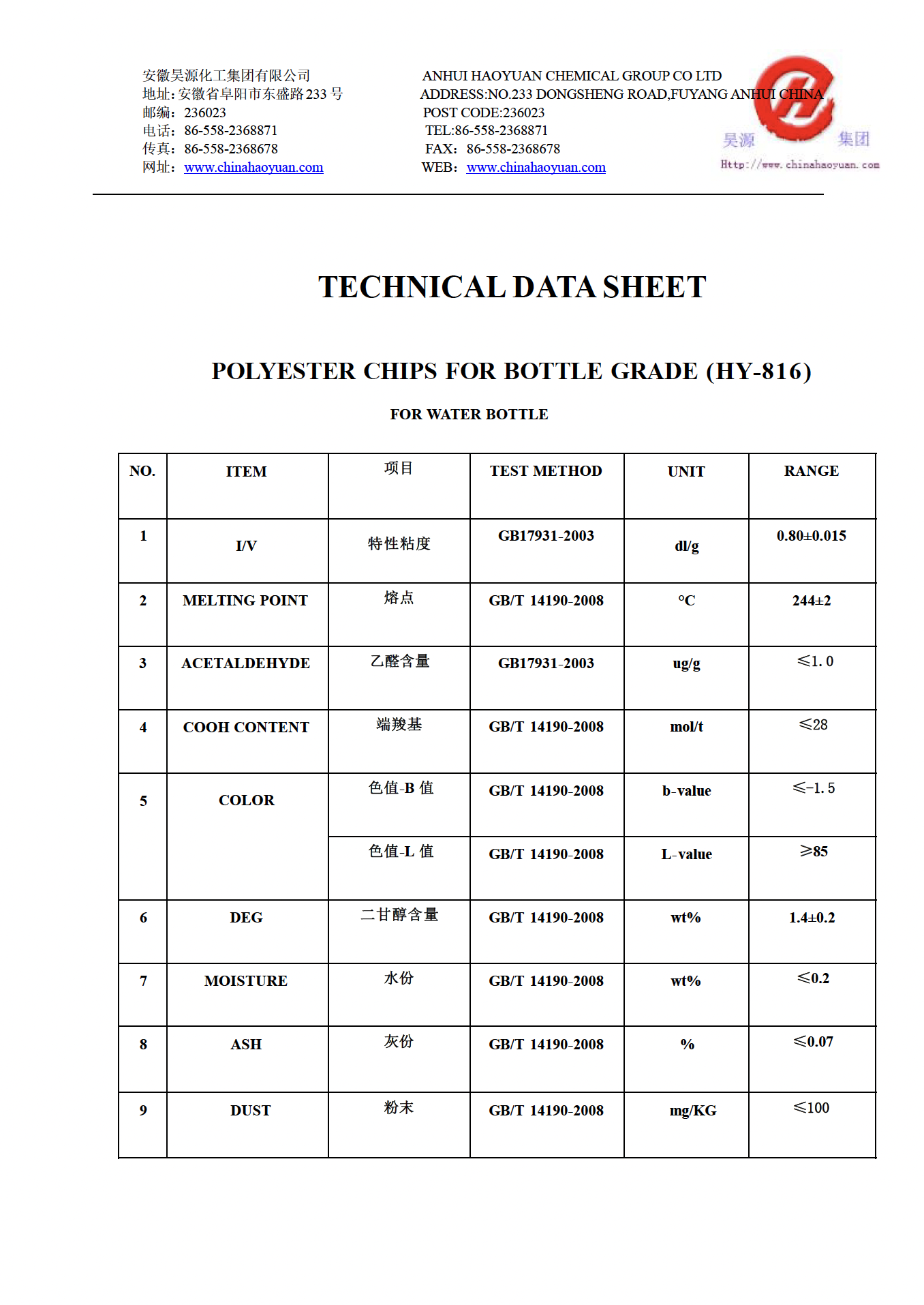 With a higher intrinsic viscosity of 0.840 ± 0.015 dl/g, HY-816 is suitable for edible oil bottles, carbonated soft drinks, and general beverage containers, offering balanced mechanical strength and excellent oil resistance. It meets the same stringent quality standards: - Acetaldehyde content ≤ 1.0 mg/kg